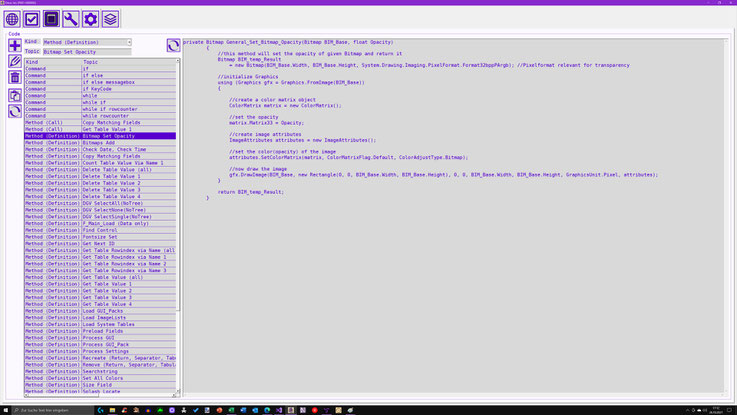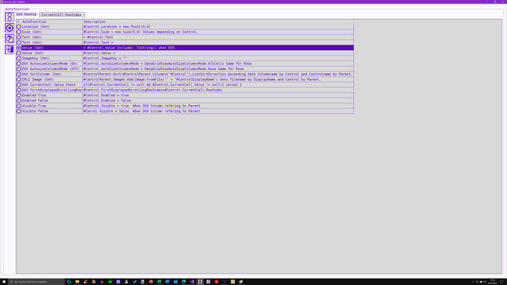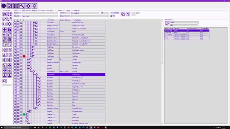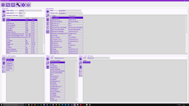Zudem können die Kurznamen für die Controls definiert und mit Attributen versehen werden. Letztere erlauben eine automatische Generierung von Code für verschiedene Zwecke (aktuell nur C#@WFA) anhand der Attribute.