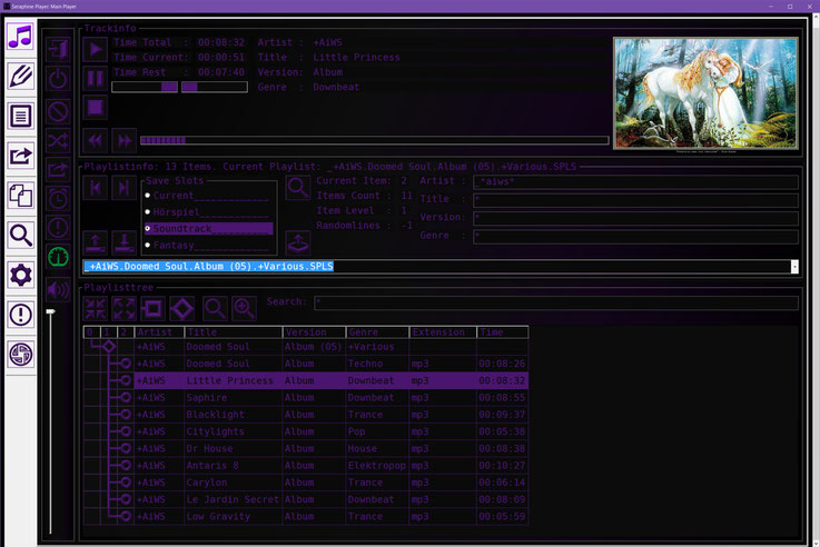 Im Unterschied zu allen mir bekannten Playern ist er der Einzige, der die Wiedergabelisten als hierarchische Baustruktur abbilden kann. Neben dem Hauptplayer an sich, der mit Funktionen wie Zufallswiedergabe, Wiederholen von einzelnen Tracks, Gruppen und Playlists daherkommt enthält er aber auch Werkzeuge um neue Tracks in die zentrale Datenablage zuzufügen und Wiedergabelisten zu pflegen. Auch ist ein Mixer sowie ein komplexer Suchmechanismus (wo war noch gleich dieses Lied überall enthalten?) sind verfügbar.